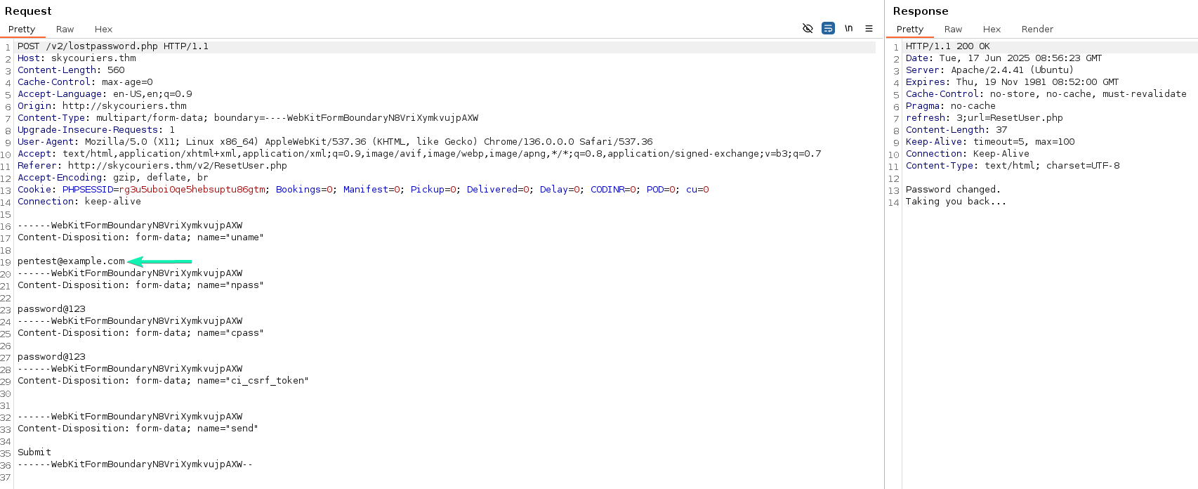 Looking around further there's a page which allows you to update your account password (http://skycouriers.thm/v2/ResetUser.php)