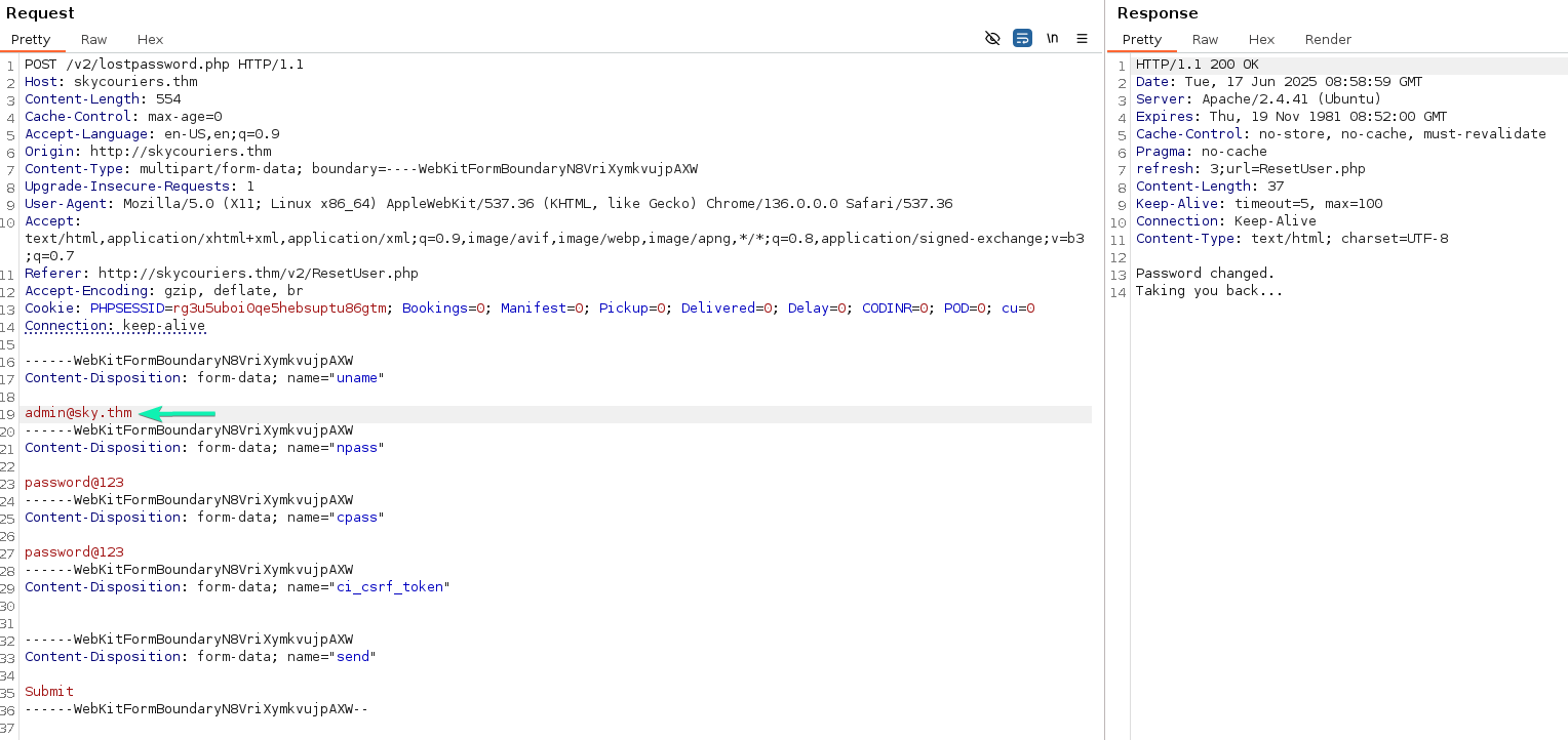 I sent this request to the BurpSuite Repeater and replaced my email with admin@sky.thm.