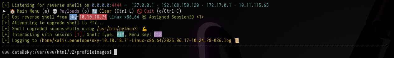 After executing the reverse shell payload in the web shell Penelope received the shell and automatically upgraded it.