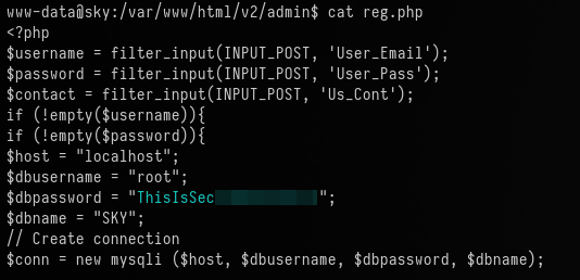 I find the credentials for the database inside the file /var/www/html/v2/admin/reg.php. However, this doesn't let us authenticate as root.