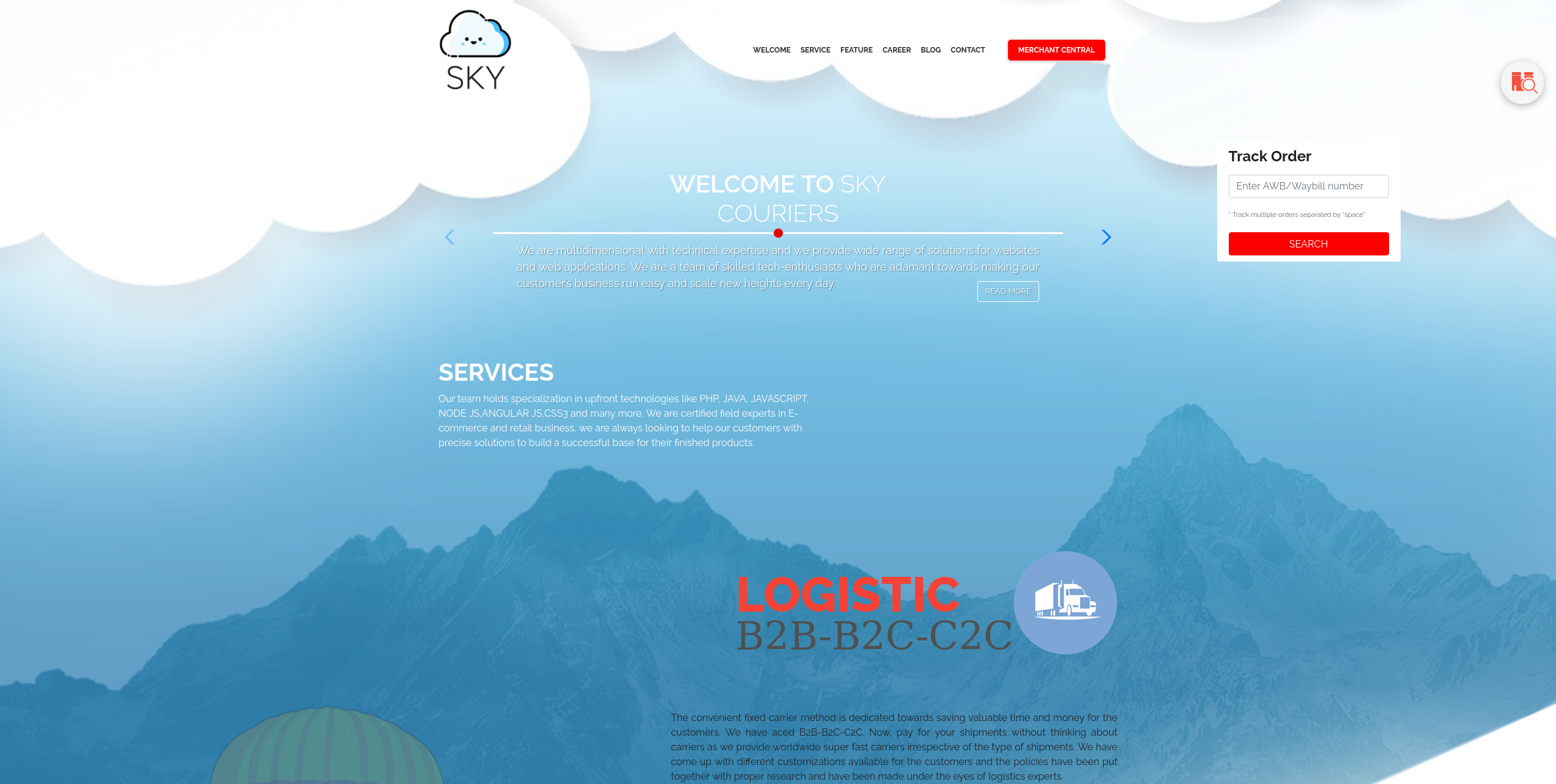 Selecting the "Merchant Central" button in the top right takes us to a login page (http://skycouriers.thm/v2/admin/login.html), with another button below it to register an account.