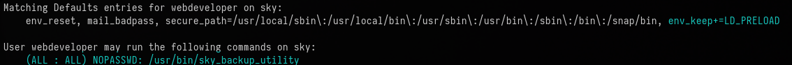 The LD_PRELOAD is used to specify one or more loaders that is loaded by the loader before all others. Since there is a binary which can be ran as sudo ( /usr/bin/sky_backup_utility) I can abuse the LD_PRELOAD to gain access to a root shell.