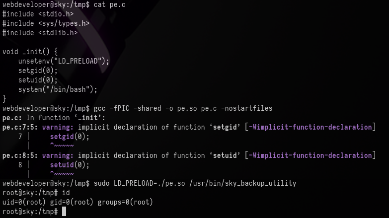 gcc -fPIC -shared -o pe.so pe.c -nostartfilesFinally, to abuse the vulnerability and gain access to a root shell I specify the LD_PRELOAD shared library environment variable, which will execute before the sky_backup_utility.