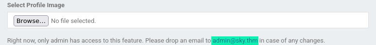 On this page you're able to edit your profile image, however, there's a note that only an admin has access to this feature and to contact the admin at the address admin@sky.thm